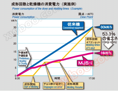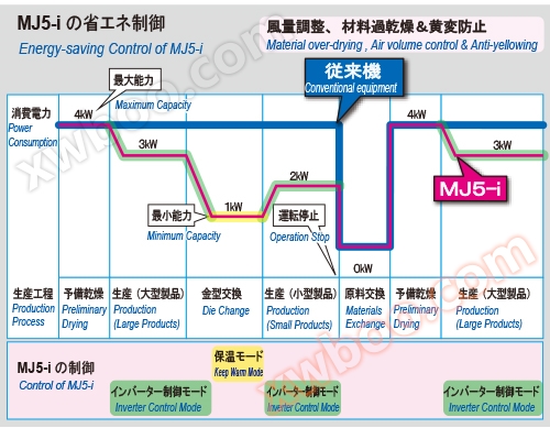 · Gli asciugatori precedenti, indipendentemente dalla quantità di materiale secco, consumano la stessa energia elettrica. MJ5-i è dotato di funzione iplas, in grado di determinare autonomamente la dimensione della capacità di asciugatura e regolare di conseguenza il consumo di energia richiesto per ottenere un risparmio energetico.